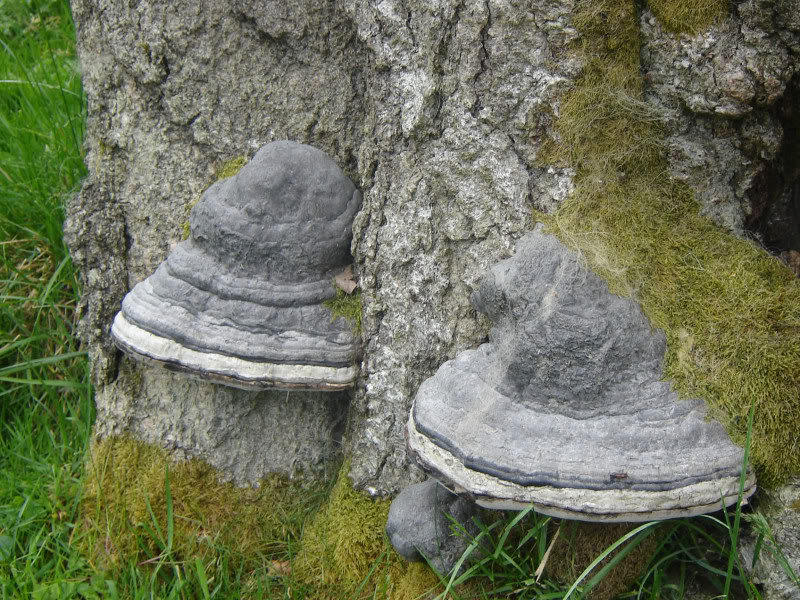 There are many birch trees alongside the track. Horse hoof fungus on the dead ones