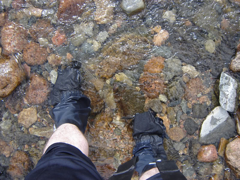 I wondered if I could use my gaiters as improvised sandals by placing them over my bare feet and pulling the draw-cords tight. It actually worked really well.