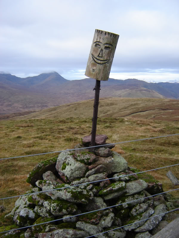 The wooden face above the summit cairn made me smile.