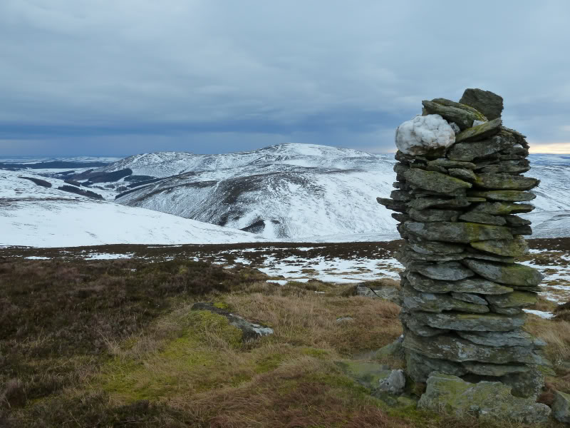 Quite an impressive cairn near the summit of Corwharn. I think the top of the cairn is the highest point, however, the base of the cairn isn't the highest ground point. The highest ground point is about 70m away from the cairn.