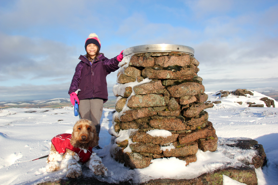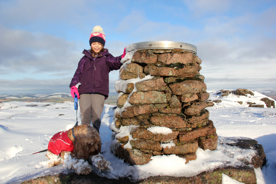 Becky and Cuillin at the summit of Bennachie (Oxencraig):