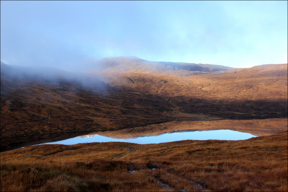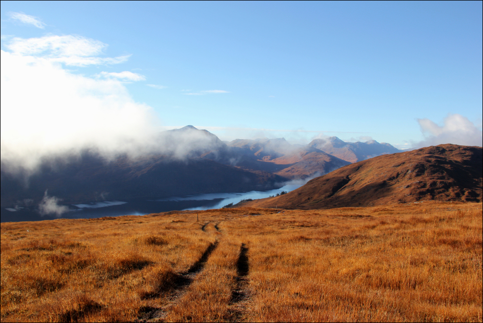 been levelled off so should therefore eventually regain a covering of grass and heather. The quality track does make for fast progress up the hill as it stops just short of Loch Blair i.e. at a height of just over 300m.