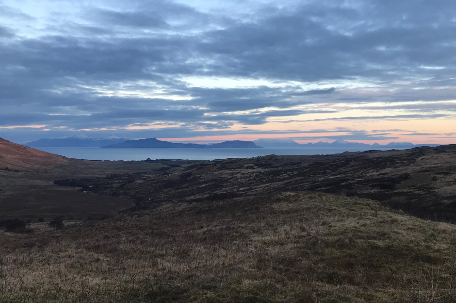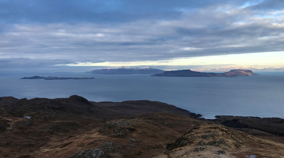 Early morning view across to Rum, Eigg and Skye during drive round to