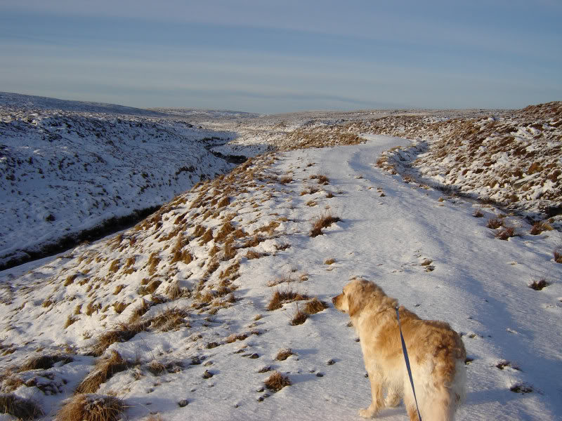 While sitting at the summit having a bite to eat, I noticed quite a bit of red on the snow. Quickly discovered that Beinn had cut both his front paws. I bandaged them up at the summit and again several times as we started walking back - but the bandages kept coming off. As we retraced our steps on the way back, I grew increasingly concerned at finding circa one mile of bloody paw prints. I knew I had to stop the bleeding.