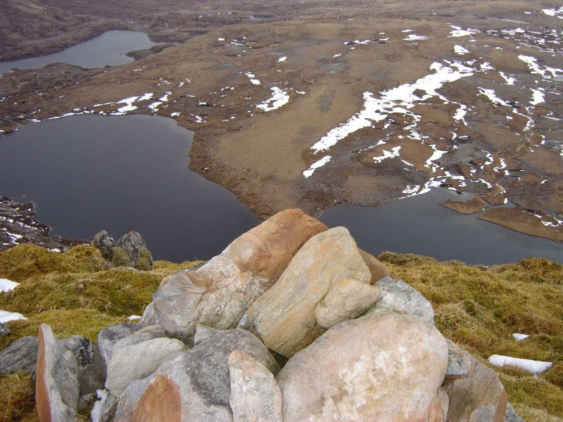 The final stretch to the summit was through very soft snow which thankfully was not very deep. On reaching the summit we stopped for a quick bite to eat and I took a photo looking over Meallan a’Chuail’s steep East-face, looking down to Lochain Meallan a’Chuail.