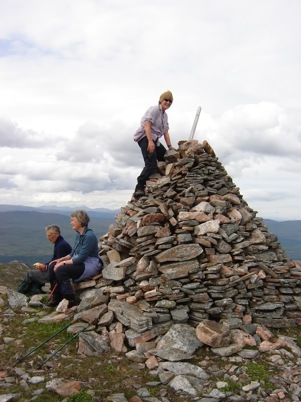 Ken, Lydia and Judy at the large summit cairn of Meall Dubh:
