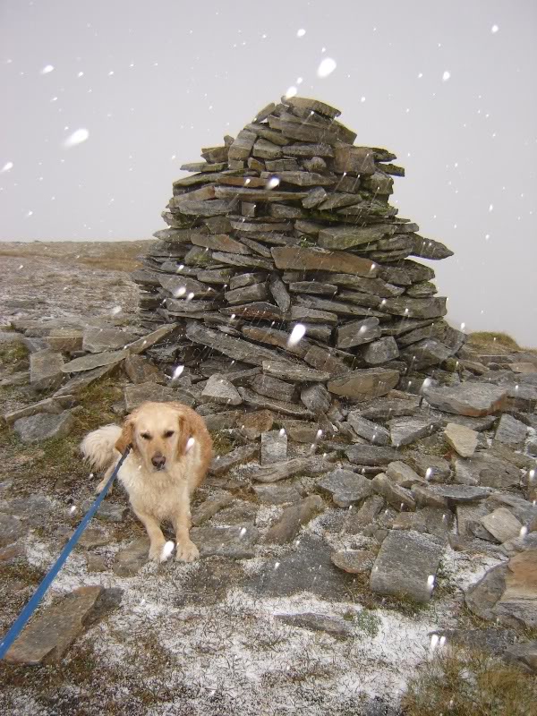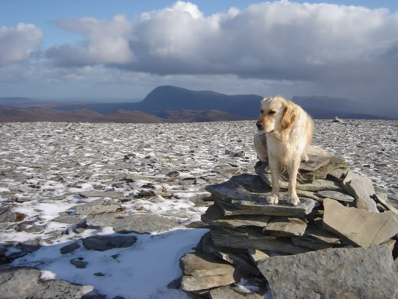 Beinn bagging the summit cairn of Sabhal Beag (Ben Hope behind):