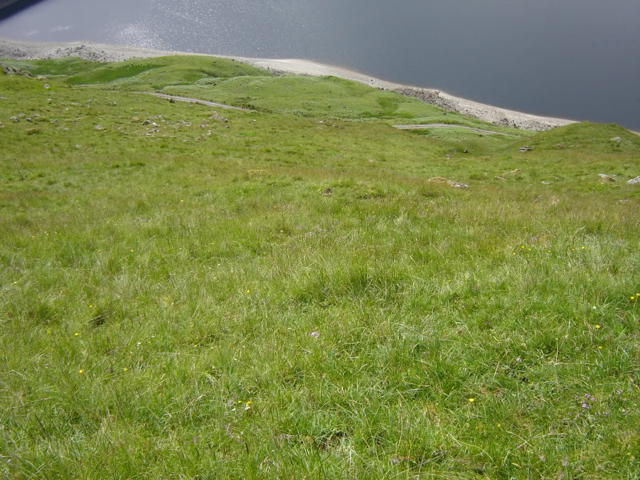 Looking down steep grassy slopes: