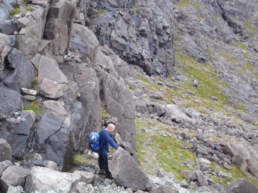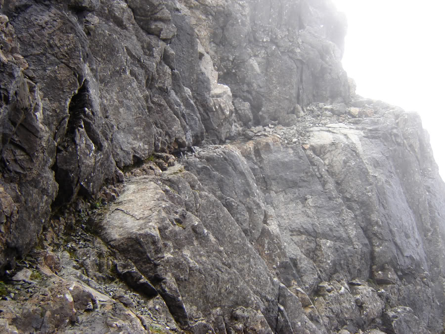 We initially followed the obvious, but precarious, ledge leading right and round the corner.