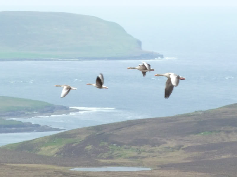 I stood watching the Great Skuas for at least fifteen minutes and while doing so also managed to photograph a group of passing geese.