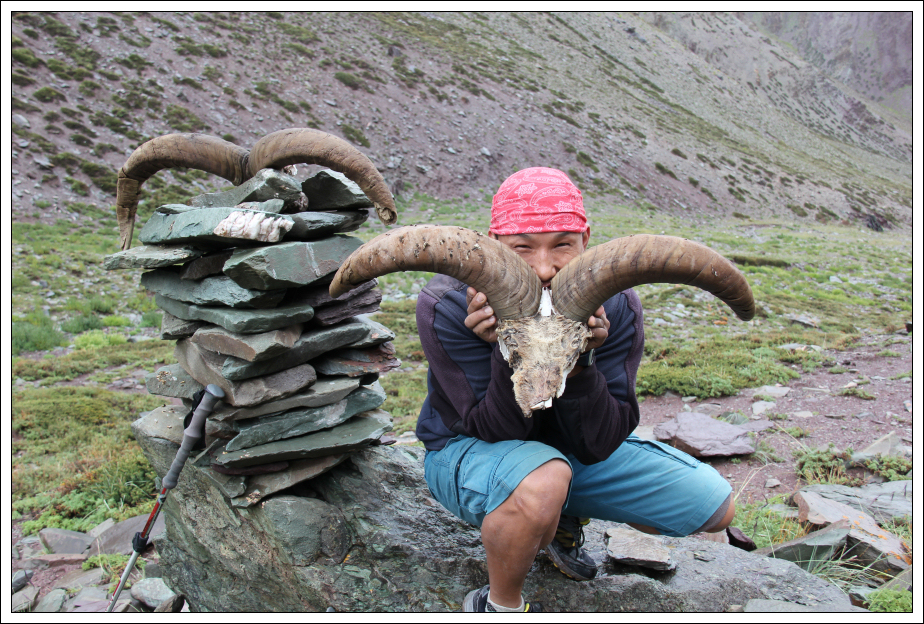 During the ascent towards Exodus Peak, we passed a cairn with the skulls of two Blue Sheep.