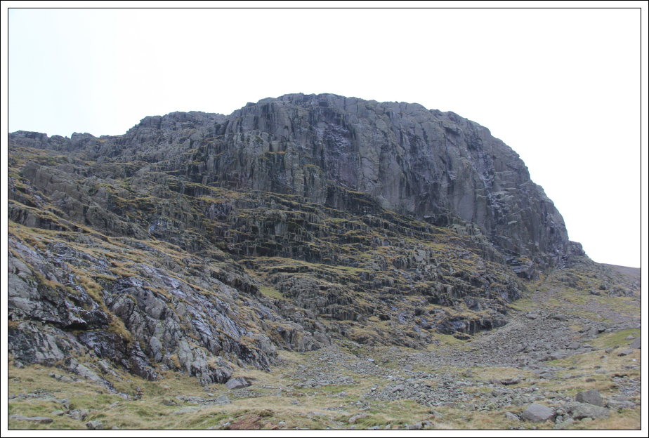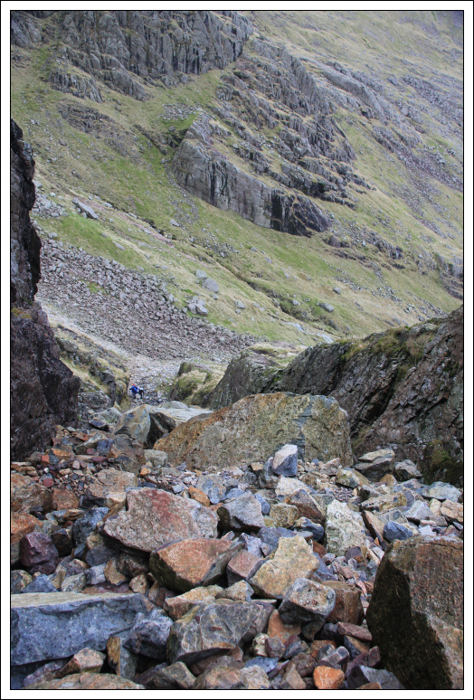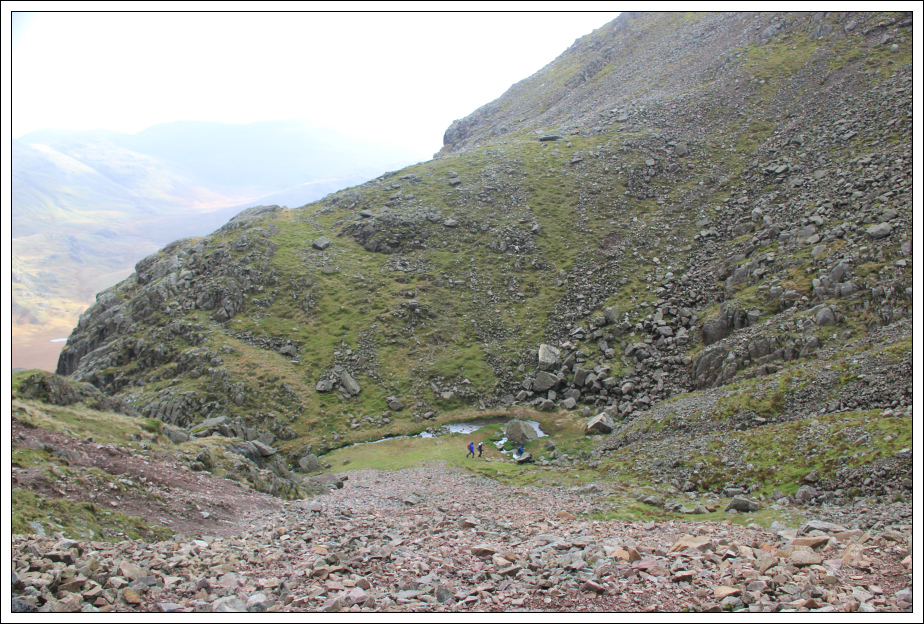The ascent up the rake, known as Foxes Tarn, was straight-forward albeit a bit wet in places. In the next photo, the people at the base of the rake give an idea of scale. I would guess the ascent to be around 50m.
