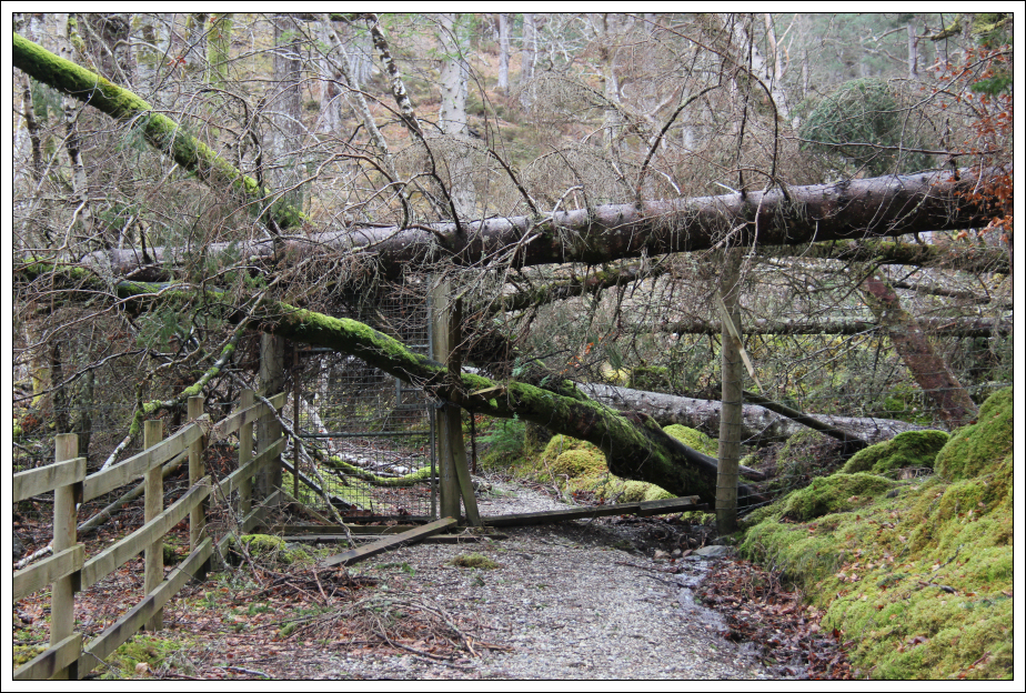 After negotiating a number of trees that were blocking the track, I then had to walk on top of several hundred metres of slippery wet branches.