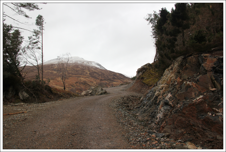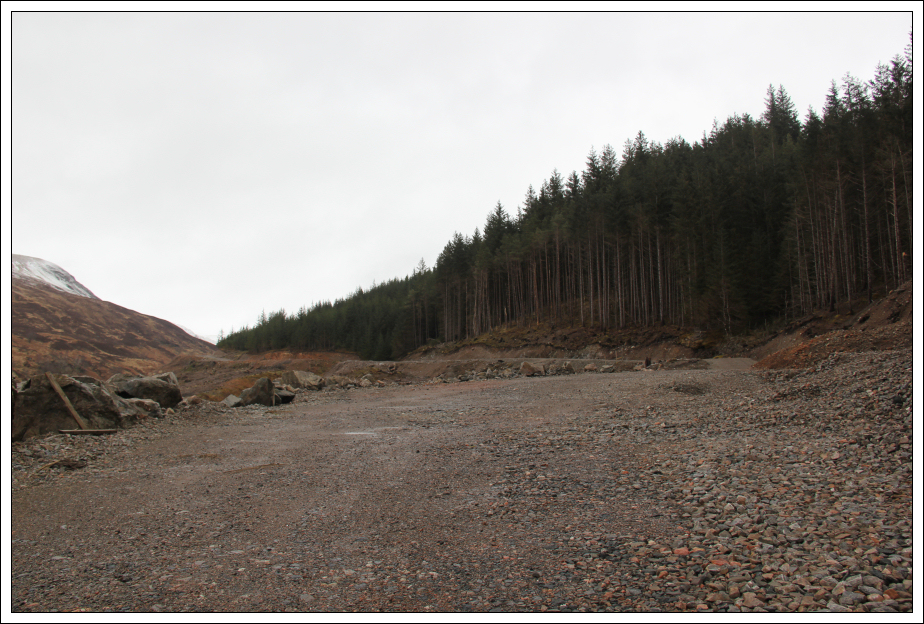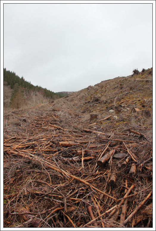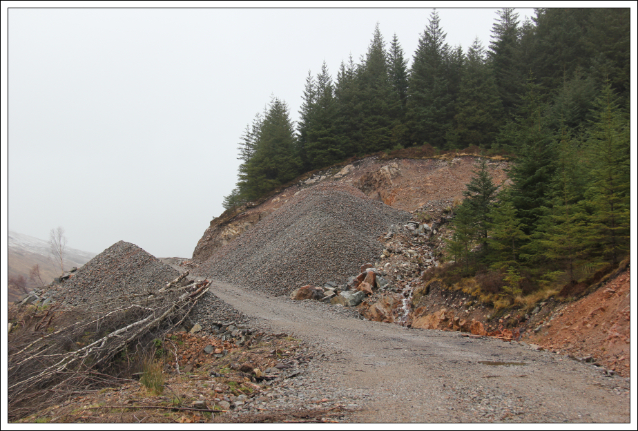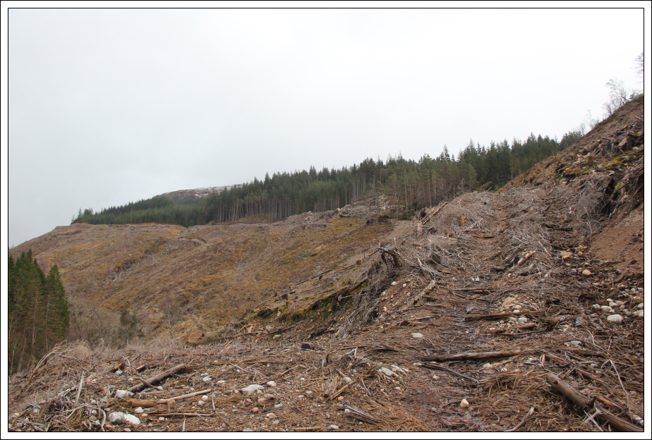 At first I found the track quite useful, but was soon upset at the destruction the Forestry Commission have caused bulldozing a complete mess of a track through this glen. The track is completely over-sized, in places at least 10m across. The verge at the side has also been scraped away making the mess possibly as wide as 15m in places.