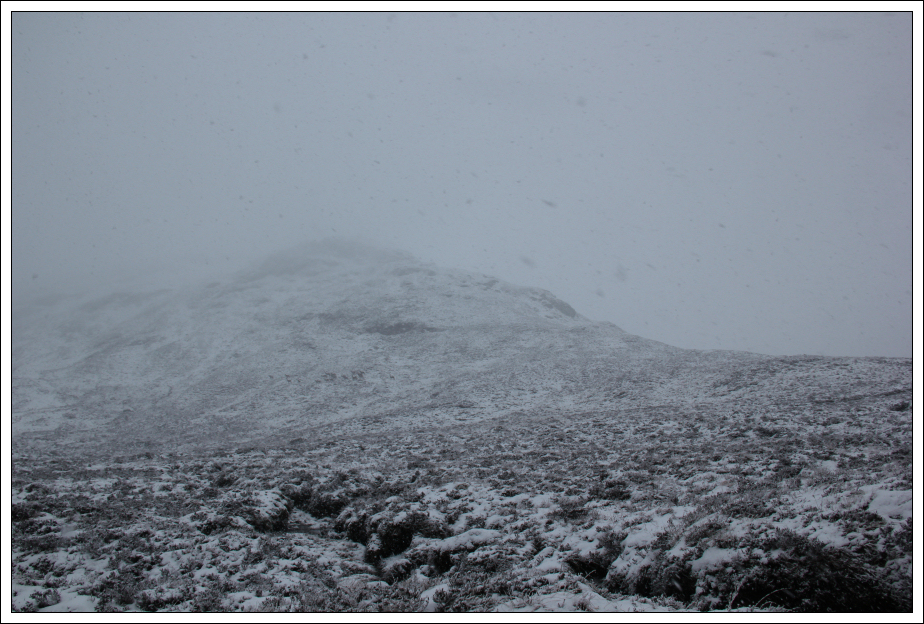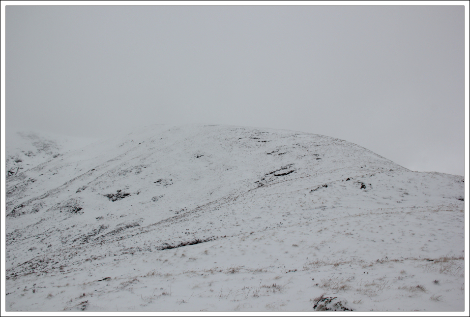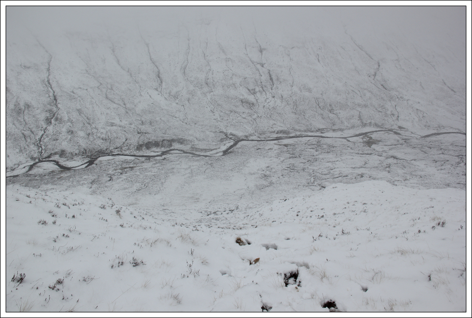 Beyond the crossing of the Allt Tarsuinn, the snow was dingin' doon and visibility was very poor. Wet grass under fresh soft snow made the ground very slippery.