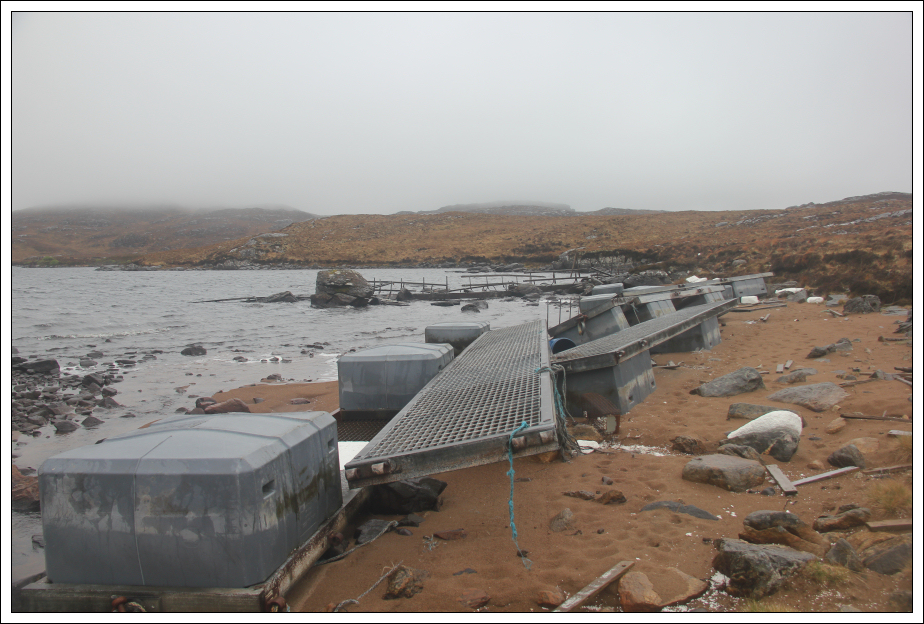 I was suprised to find such a mess along the shore of Loch Tungabhat. The large grey boxes would appear to be full of polystyrene balls. I assume these acted as floats for the metal structure like some kind of pontoon bridge.