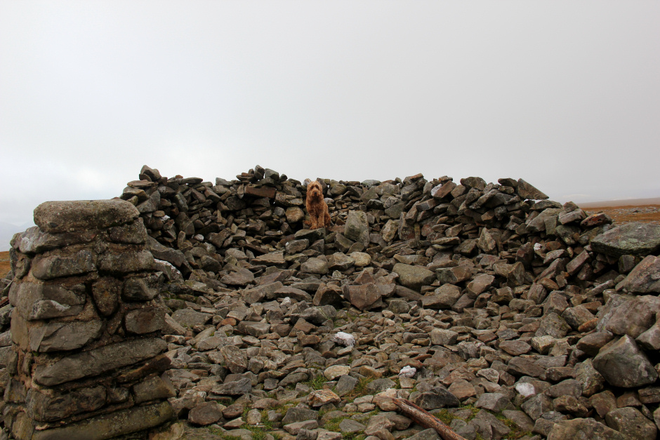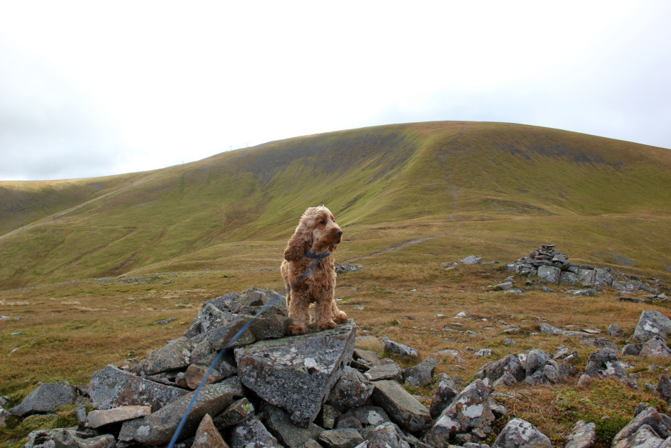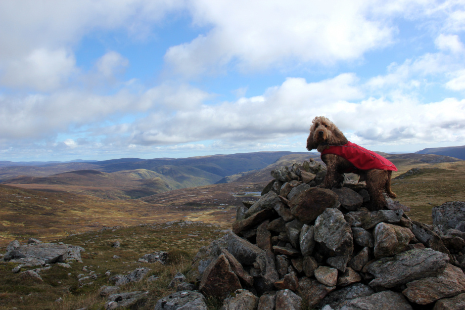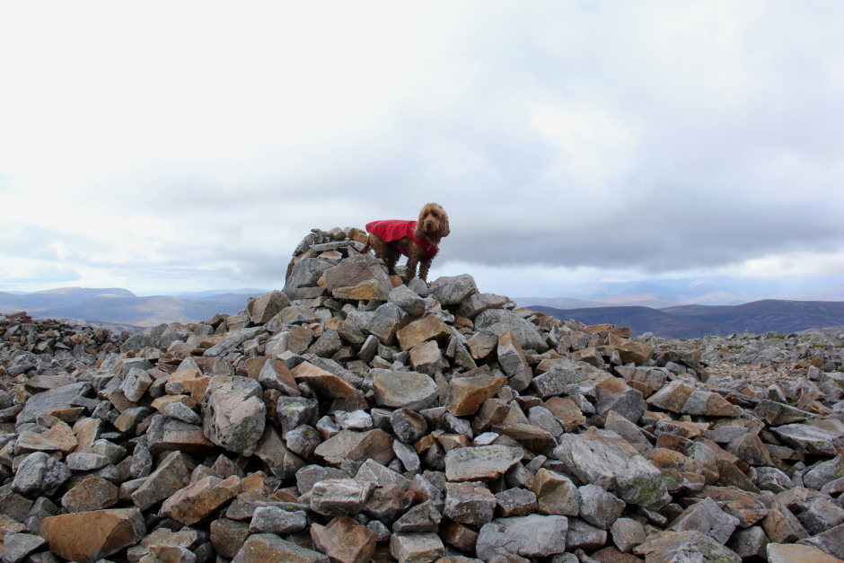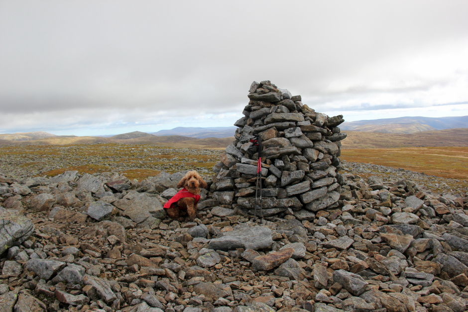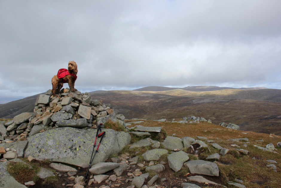 On reaching the summit of Crow Craigies, we met another two walkers who had come from Spittal of Glenmuick via Broad Cairn. By now, Cuillin was getting used to standing on the cairn to get his photo taken.