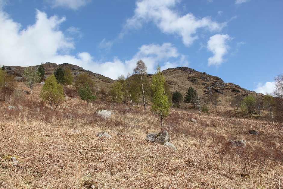 I started my ascent up through an enclosed area of young trees. In hindsight this was not a good idea as there was lots of bracken and a six-foot high deer fence to climb over at the top. Had I walked a couple of hundred metres further along Loch Etive, I could have avoided both the bracken and the deer fence climb. I would remember this during the descent!