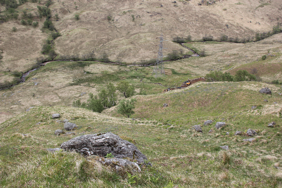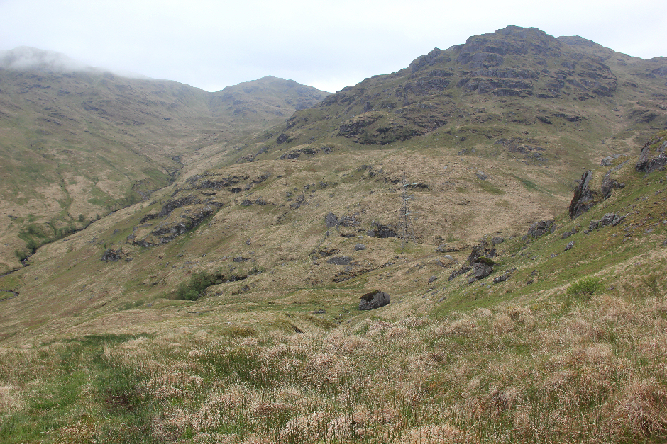 Once beyond the crags the descent was easy enough that is until reaching the final steep section down to the pylon access track. The hillside here is covered in bracken, so while this was do-able in May, it would be much more unpleasant in July to October once the bracken is considerably higher.