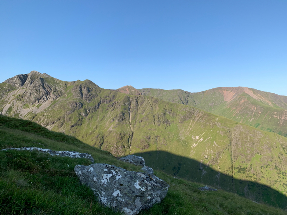 Looking back to Sgurr an Iubhair and Sgurr a' Mhaim during ascent of Am
