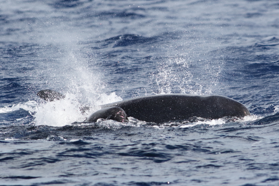 Mother and baby Sperm Whales blowing simultaneously: