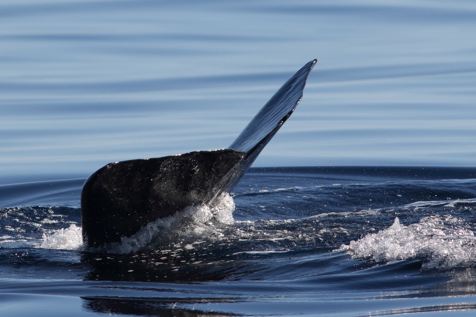 Sperm Whales show their backs and then their flukes (tails) as they go for a deep