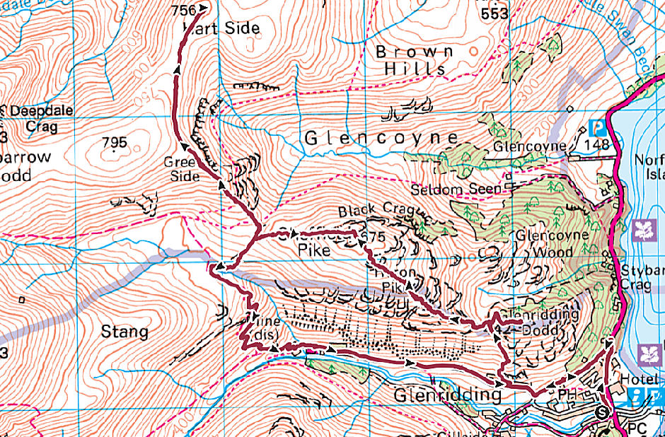A592 to pick-up the track leading towards the Helvellyn Youth Hostel.