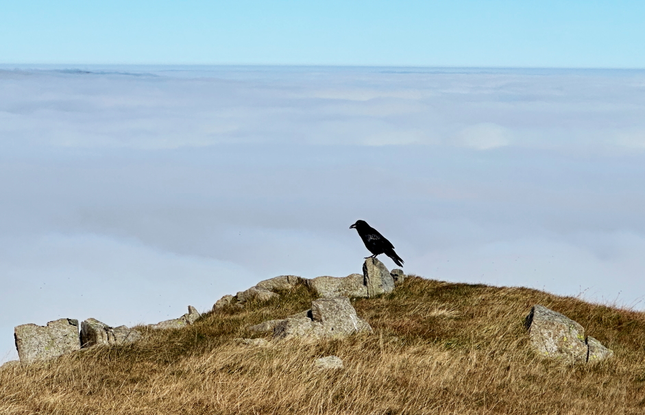 A raven sitting above the cloud inversion: