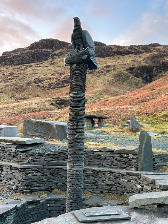Bird statue at Honister Slate Mine car park: